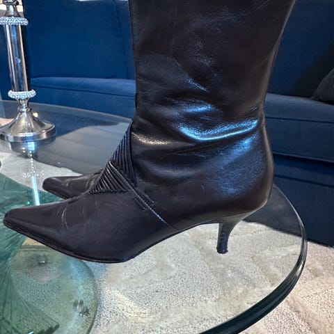 Lekre støvletter med røde såler og skinnbånd rundt ankelen. Litt platå i fotsålen.