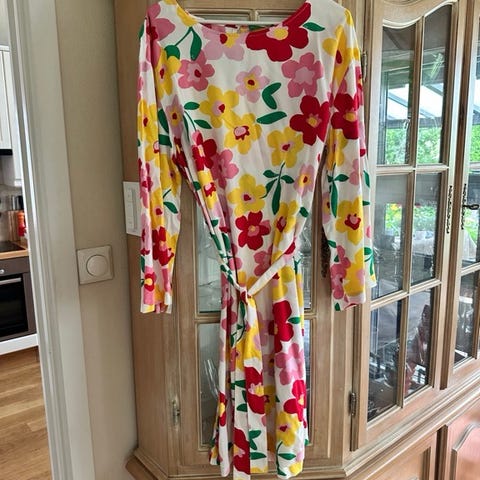Selger denne kule, litt bohemske kjolen fra Benetton i størrelse L (litt liten i størrelsen). Mål: 105 cm lang, 46 cm bred (under rosa bånd). Glidelås i siden. Materiale: 72 % bomull, 28 % silke, fôr i polyester.
