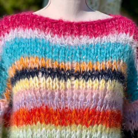 Dette er strikket i 3-lag med garn, Kid Mohair, bl.a Lieve Mondial, men litt endring på fargene