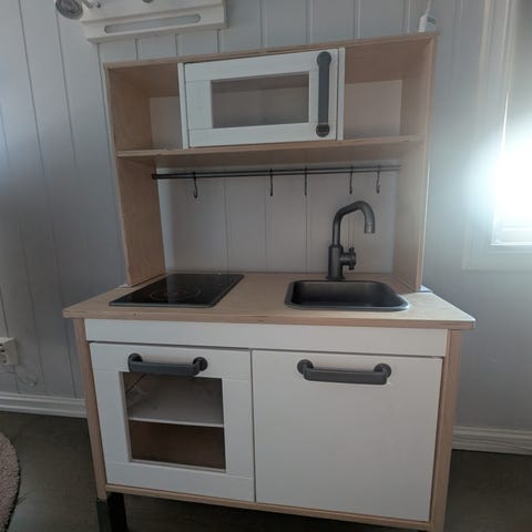 Komfyr, kjøleskap og diverse møbler (i hardplast) til dukkehus . Dukkehuset er dessverre kastet
