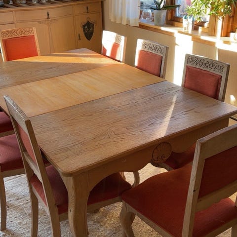Vi snakker her om ett solid spisestuemøblement på rundt ett hundre år bestående av bord med tre ileggsplater, seks stoler og ett tilhørende skap.