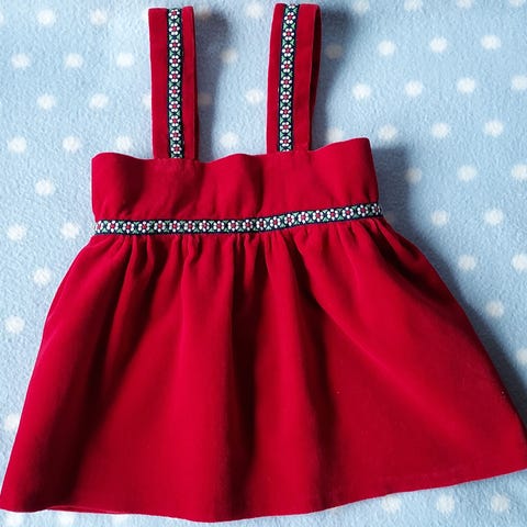 Vintage/Retro: Rød jakke med sløyfer på og marineblå bukse.