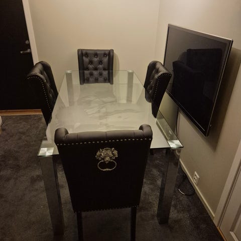 Borde er 180cm x 100cm. 2 tilleggs plater som festes på enden av hver side som er på 50cm hver. Enkelt å feste. Stolene følger ikke med. Bordet sendes ikke, må hentes i Sandefjord.