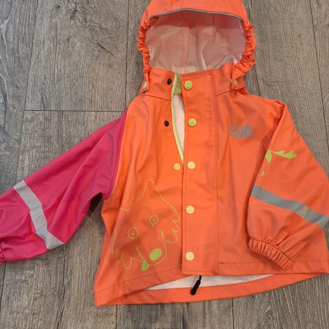 Regnjakke og regnbukse med reflekser i størrelse 3-4 år. Lite brukt, da det har vært ekstra sett i barnehagen. Uten strikker til føttene.