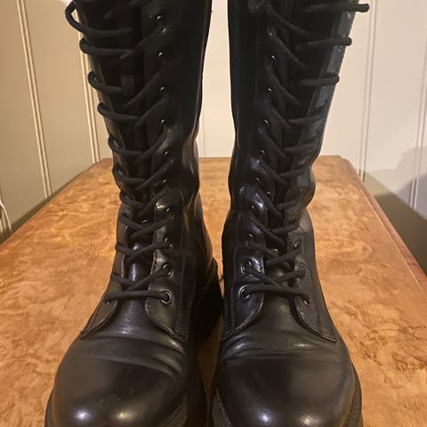 Skoene er lite brukt og av skinn (falskt men fint og godt bevart) med mykt stoff inni, glidelås på innsiden og strikk bak (på bildet)