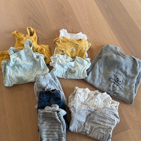KLESPAKKE str. 70 / 74 mye med prislapp på. Plagg i både bomull, bambus og ull.