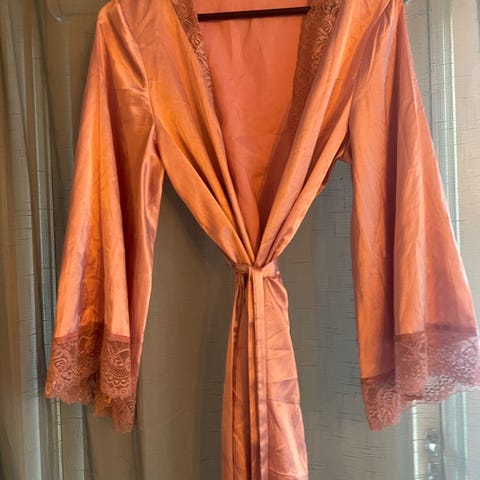 Nydelig korallfarget maxikjole fra Floyd str S, normal i størrelsen. Sjal medfølger. Selger også passende pensko i str 36, 200kr.