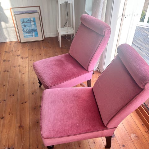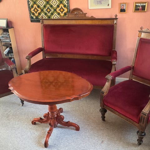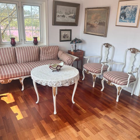 Unik og flott sjeselong. Mange timers håndverk til salgs på grunn av plassmangel. Dette flotte møblementet er nyomtrukket med Designers Guild stoff.