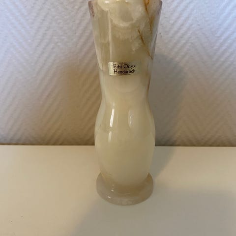 Tung og dekorativ vase i massiv onyx. Høyde 22 cm / lengde og bredde 7,5 x 7,5 cm.