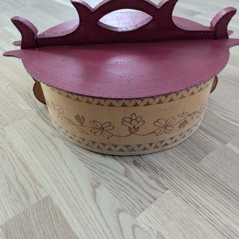 Rosemalt stor kake-tine. Mål 34 cm i diameter og 16 cm i høyde. Ingen skader eller feil.
