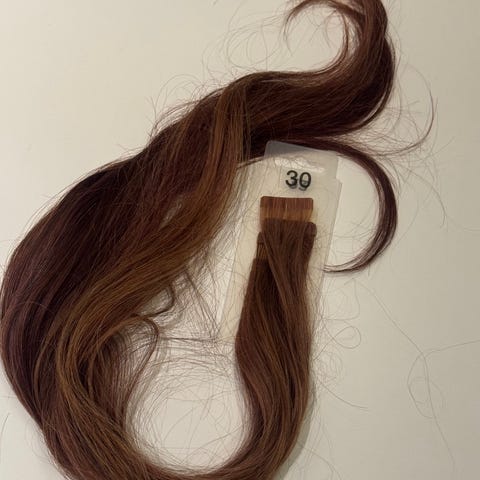 Brukt EN gang. Som ny. Ekte hår. Brunette. Kan snurres rundt hestehalen også. Men er ment for å legges med en tynn gjennomsiktig tråd over hodebunnen for å oppnå fyldigere og evt lengre hår.