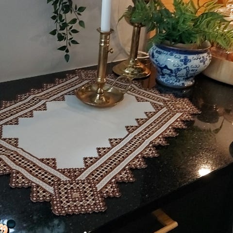En nydelig duk med mye søm.