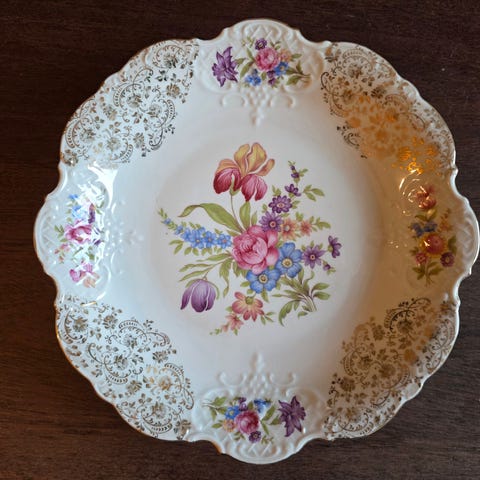 Selger et nydelig fat fra Porsgrund porselen - Rosebukett. Ingen nag eller krakelering. Flott inntakt gullkant. Diameter 23,5 cm. Selges for kr. 100 + porto. Kan også sendes med PostNord for kr. 69.