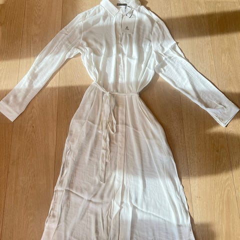 Fantastisk myk sommerkjole i naturmaterialet viskose/rayon. Sitter nydelig på, faller mykt, lett og behagelig. Str S/M. Kjøpt for 1500, selges for 300. Brukt et par ganger før jeg vokste fra den, desverre. Hentes på Sinsen eller sendes mot porto.