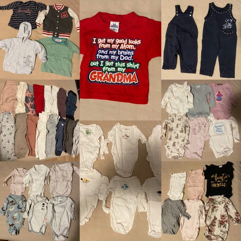 klespakker med langermet trøyer, genser og bukser, hverdagsklær, penklæar, joggebukser, joggedress, joggesett, fleece dress / fleece overall, finstrikket bomullsdress, kosedress, denim / dongeri / ola bukser, selebukser, sparkebukser, gensere, hetegensere, cardigan, skjorter, bodyer, pyjamas / pysjer / nattøy, sokker