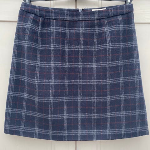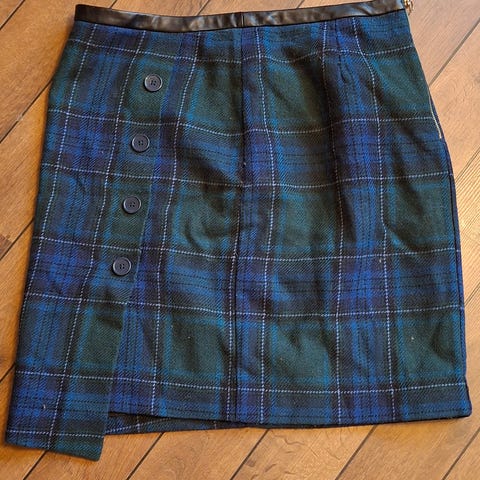 Rutete skjørt / miniskjørt / omslagsskjørt fra Holly & White by Lindex. Str. 38. Spenne i imitert skinn. Ytterstoff er 50 % ull, 50 % polyester.