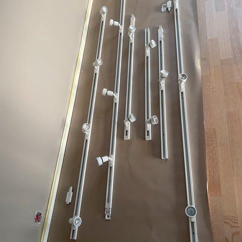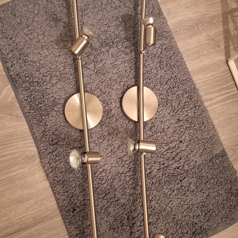 Pent brukt takskinne med 6 spotter. Lengde på skinne er 180 cm, men den kan bøyes slik man ønsker i begge ender. Hvert ledd er 60 cm med 2 lamper på hver som også kan endre retning.
