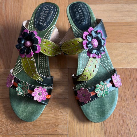 Sandalene er utrolig fine, men er dessverre for små for meg. De er laget av tre og skinn med fine detaljer og snøring. De er i størrelse 37 og fra Fornarina.