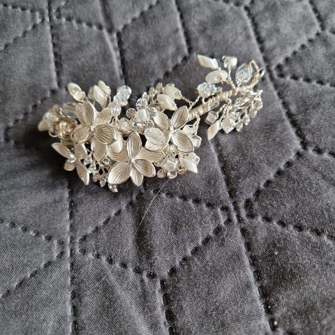 Hårpynt «Hair vine dainty floral» i merket Poirier kjøpt hos brudesalongen Anna Johnson. Vakker hårpynt med perler, glassperler og sølvblomster.