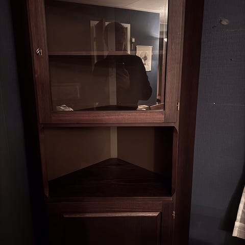 Seksjonen er i lakkert flammebjørk, og er nok bortimot 70-80 år gammel. Noen skader har den dessverre fått, men låser, skuffer etc. fungerer.