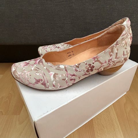 Flotte dame sko, brukt to ganger. I fargene lilla, brun, gul, beige. Blomster dekor. Fra Hispanitas. Nypris var 800.