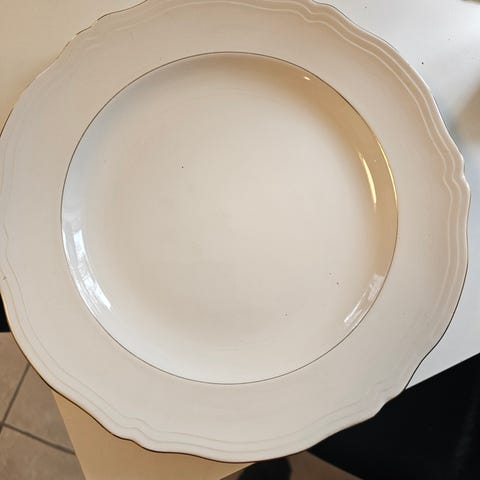 36.cm stort fat og 25.cm suppe tallerkner . Hele og pene. Det er 6.stk med gull kant og en grønn stripe . De er Engelske se sign.