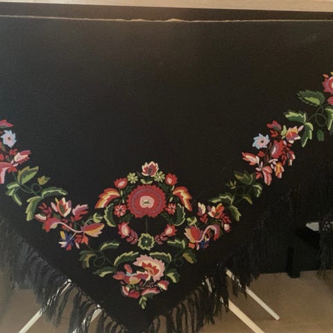 Brodere sjal og forkle. Har et sett Skjæveland ferdig kr 9900 Kan sy linningen på forkle men da blir det litt tillegg i prisen. Syr også lommer og skjorte på bestilling . Ta gjerne kontakt om du ønsker et annet mønster så syr jeg det