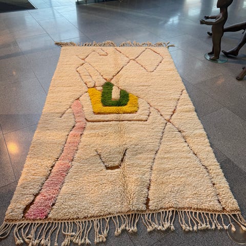 Dette er et håndlaget, lokalprodusert og unikt kunstprodukt laget på Aurora Verksted i Bærum. Teppet er aldeles lekkert, lunt og deilig. Teppet setter definitivt særpreg på omgivelsene, har karakter og dybde. Fint som gulvteppe og nydelig som veggteppe. Teppet er i langhåret alpakka ull i fargene kremhvit, blått, grønt og brunt. Teppet har ligget i dette hjemmet ett år, er meget godt holdt og ser helt nytt ut.
