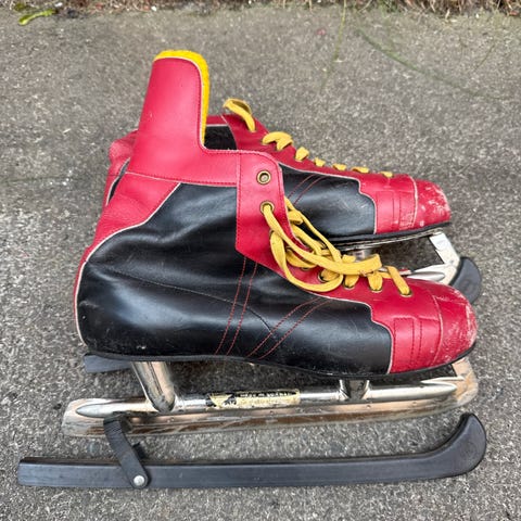 Lengde ca 30 cm. Mangler nøkkelen for å skruve fast til skoene, men dette er en vanlig firkantskrue. Bra stand, litt overflaterust.