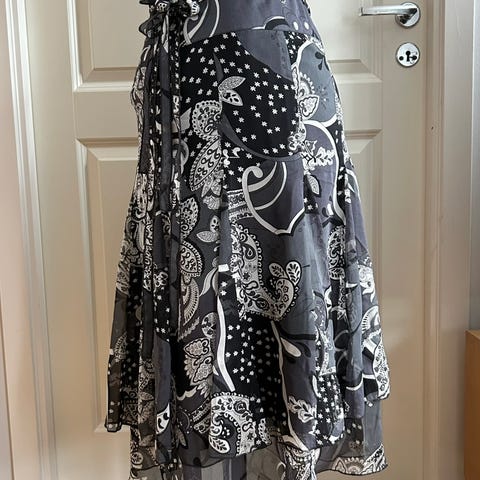 Praktisk skjørt med panel foran med knapoer på begge sider. Fuksia farget bonull blandet stoff. Elastisk midje, omkrets ca 62 cm, kan stretches litt. Lengde ca 68 cm. Omkrets i bunnen ca 230 cm