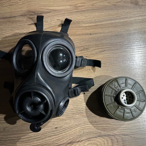 Gassmaske og vannflaske