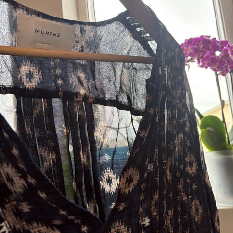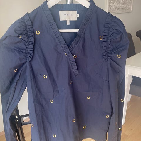 Lekker bluse fra Munthe i str S. Brukt kun et par tre ganger da fargene ikke kler meg så godt. Den fortjener å bli brukt, kjempefin til både jeans og penere bukser/skjørt. Viscose. Topp skjorte bluse
