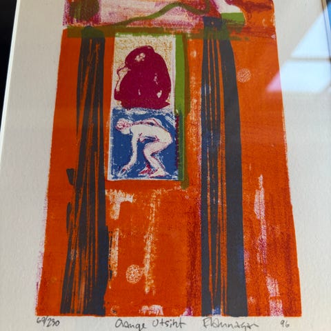 Maria Deguchis litografi «Symphonie du crepuscule». Arkformat: Høyde 75 cm, bredde 54 cm. Motivmål: Høyde 60 cm, bredde 40 cm. Nummerert og signert.
