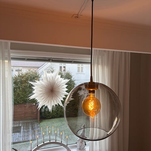 Pent brukt Belind tak lampe kjøpt på Christiania. Fint å ha over spisestuebordet. Sotfarget. Ny pris 4899 Kr. Størrelse H: 29. Bredde på det tykkeste: 80. Hbo 2500 kr