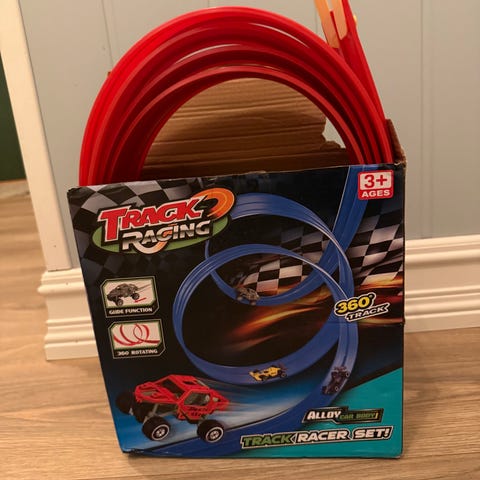 Plastikk biler/bilbane der bilene blir «skutt» ut og skal gjennom hinder. Kjekk leke å ser helt ny ut