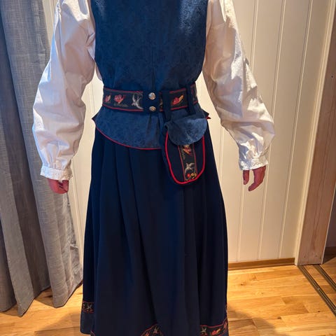 Selger min festdrakt str M, men den har mulighet å utvides. Farge sort med hvitt broderi som ikke er brodert fast, men limt fast.