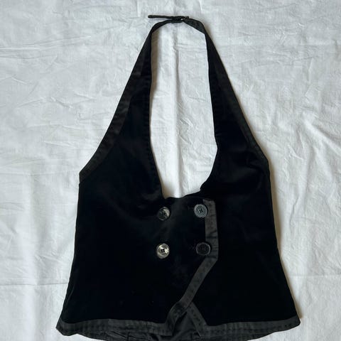 Denne overdelen har et rutete mønster i svart som glinser. Og den er ganske tung grunnet at hele overdelen er dekket av glimmer. Den har tynt for av nylon på innsiden og glidelåslukking i nakken. Og strykefri😅