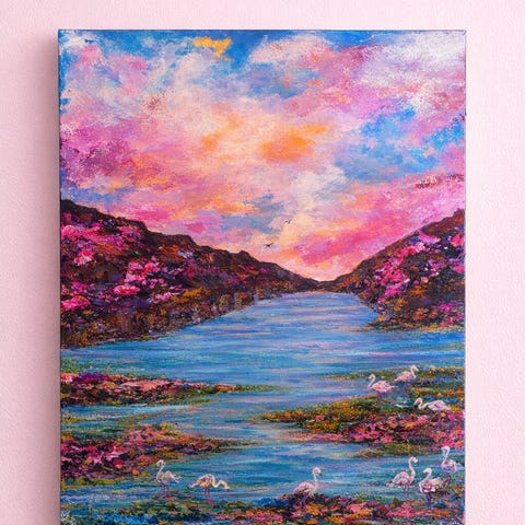 Til salgs: "Vannliljer" - et fengslende oljemaleri som vil berike ethvert rom med sin skjønnhet. Størrelse 52x65 cm. Dette kunstverket fremkaller en følelse av ro med sine levende vannliljer i nyanser av rosa og lilla som flyter på vannoverflaten under en himmel full av varme farger. Et must for enhver kunstsamler eller for å gi det perfekte pustet av natur til ditt hjem eller kontor.