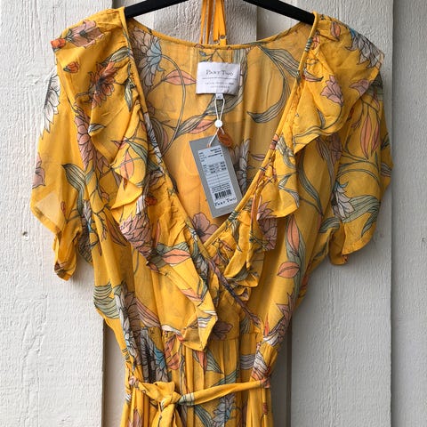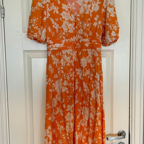 Pen gul blomstret kjole i fint stoff med glans, str S, som ny!