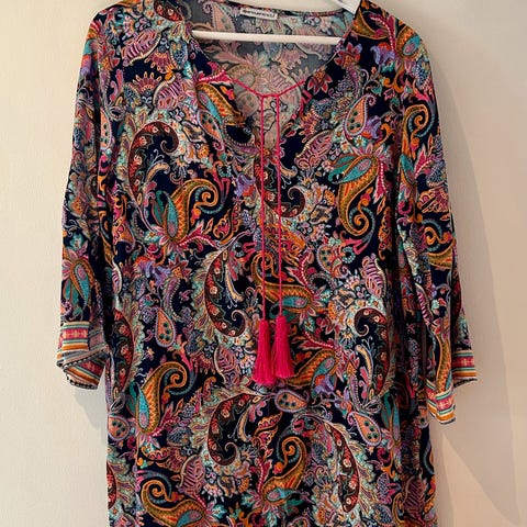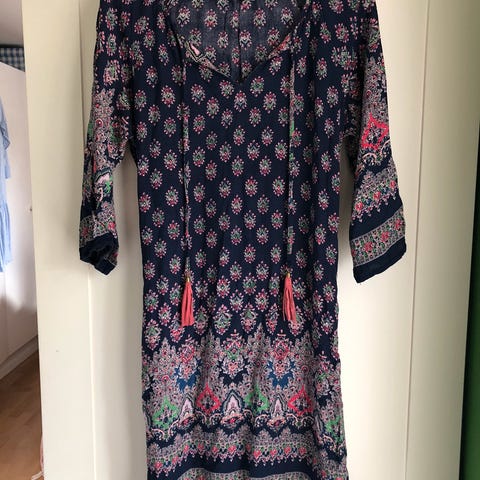 Nydelig og nett kjole, str M som tilsvarer 38/40! Deilig silke som slynger seg fint rundt kroppen men et ikke ettersittende! Flotte farger i lilla, rosa, blått, hvitt, detaljer i sort/grønt!