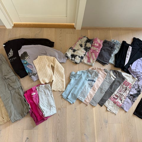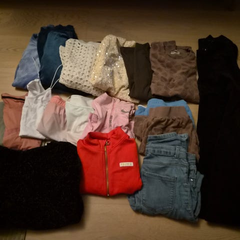 Jente klespakke - jeans, sommer bukser, genser, topper langermet, t-skjørter, shorts, braketten (topps), strømper, sokker... Str 158-164 cm-XS (12-14 år). Selges samlet kr 1000. Masse klær for pengene. Bra kvalitet kle fra Benetton, Okadi, Zara, Next....