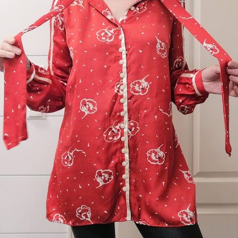 Svart, lang, fullkneppet skjorte, kort kjole, eller skjortekjole med hvitt prestekrage, blomstermønster, hvite dekorative satengbånd og lange knytebånd i halsen. Lang ermer. Subtilt børstet inni, blank og glatt utenpå. Litt lenger bak enn foran. Mangler stoffinfo, men gjetter viskose (kan ta feil).