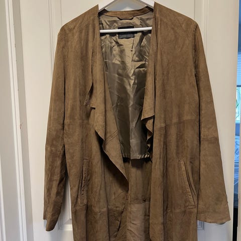 En lett og ledig jakke med slag på kragen og belte sydd inn i jakken. Ermene er 3/4 lang med en glidelås i gull.