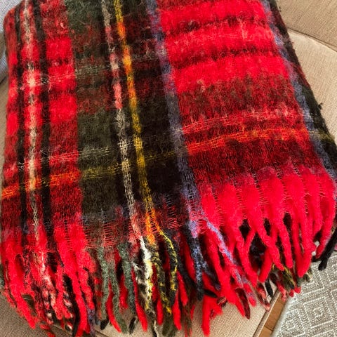 Ligget til pynt på soffa og i et skap. Vært katt i huset. Ikke vasket. Er tykk god ull. 160cm lang pluss frynser og 132 cm bred. Dette er det siste av 4