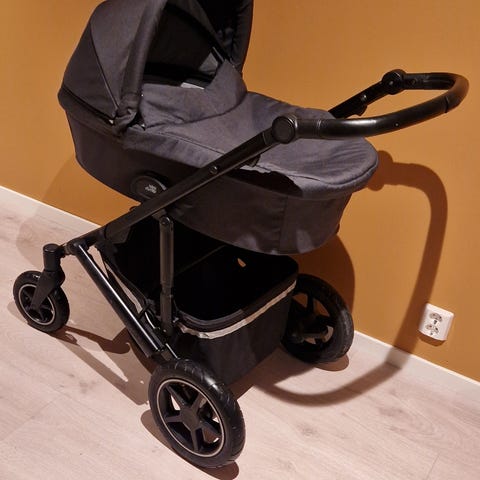 Britax Römer barnevogn med sort/grå tekstil. Barnevognen har justerbart solskjerm og sikkerhetssele. Vognen er brukt som sovevogn i barnehagen, svært lite og pent brukt.