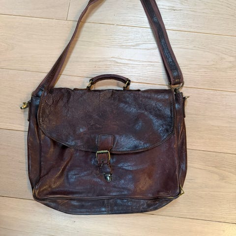 Skinn skulderveske, solid og stor, romslig plass til A4-format. 2 innvendige lommer m/glidelås. Den ene i hele veskens høyde og bredde. Skulderreimen er regulerbar og måler 110 cm på det lengste. H 26 cm, B 36 cm, B i bunnen 12 cm. Vesken er lite og pent brukt, god som ny. KUN KR 795!!!
