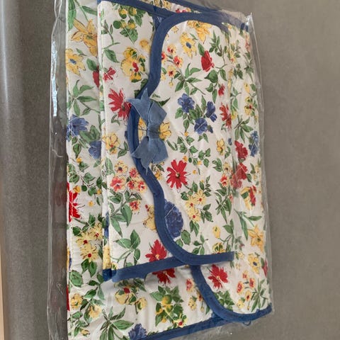 Retro toalettveske, lite brukt, 5 innvendige lommer, pluss et stort rom på utsiden. Glidelåslukking. B 29 cm, H 18 cm, B i bunnen 8,5 cm. Kun kr 150 !!!