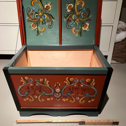 Rosemalt kiste med original rosemaling fra Drangedal, Telemark. Malt av "Drangedalsmaleren". Eierinitialer og dat. 1813.