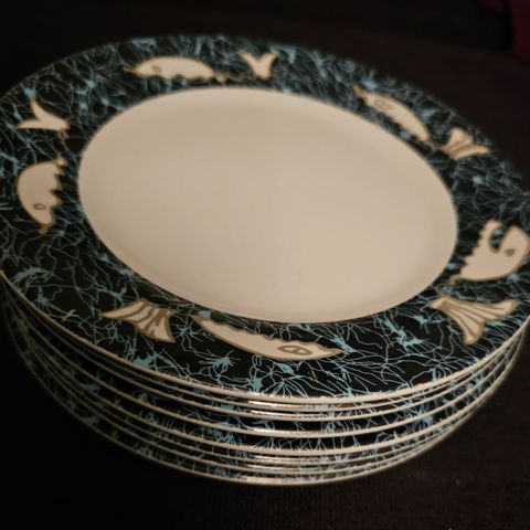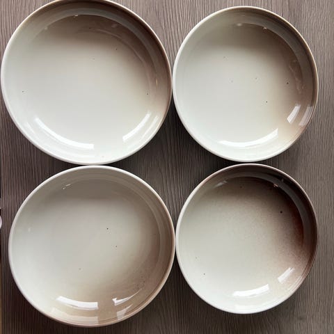Fire tallerkner selges billig, som synlig på bildene er de ikke spesielt fine, men de fungerer absolutt til sitt formål. 21 cm.