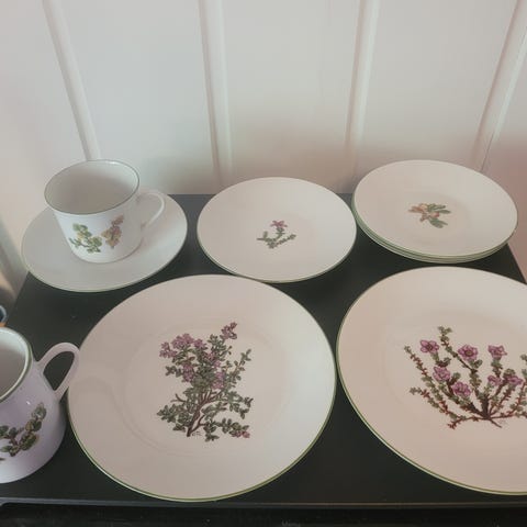 5 sett, asjett, kopp og skål. Fra Porsgrunn Porselen. Serien heter Fjellflora og er tegnet av Dagny Tande Lid. Sett: Rødsildre, Flekkmure, Greplyng og to Dverbjerk. Helt skadefri. Kr.280 pr.sett eller kr.1300 for alle